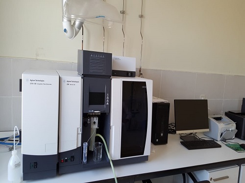 Atomik Absorbsiyon Spektroskopisi Cihazı, elementel analizler için kullanılan önemli bir cihazdır. Örnekteki aranan elementler, elemente özel dalga boyundaki ışığı soğurması yardımıyla bulunmaktadır. Katot lambada, aranan elementin dalga boyu genelde elementin kendisinin uyarılması ile elde edildiği için, örnekteki miktarlar için keskin sonuçlar verebilmektedir. Genellikle metaller için kullanılır. AAS kimyasal işlem laboratuvar analizlerinde kullanıldığı gibi, günlük hayatta su kirliliği, toprak kirliliği ve hava kirliliği oluşturan elementlerin limit miktarları doğrultusunda uyumluluk analizleri için de kullanılmaktadır. Birimimizdeki AAS grafit yakma sistemine sahiptir. Elektrotermal atomlaştırıcı olarak grafit fırın adı verilen 2-3 cm uzunluğunda 1 cm iç çapındaki tüp kullanılır. Bu tüpün her iki yanına bağlanmış direnç telleri ile ısıtma yapılır. Fırın elektriksel dirençle 3000°C’ye kadar istenirse kademeli olarak ısıtılabilmektedir. Alevli sistemlere göre daha pahalı fakat daha avantajlıdır. Özellikle ağır metal elementlerinin analizinde ppb düzeyine kadar inebildikleri için daha fazla tercih edilmektedir. Çözelti içerisindeki element tayinleri laboratuvarımızda bulunan Atomik Absorbsiyon Spektroskopisi ile gerçekleştirilmektedir. Miktar tayini yapılacak olana, elementin numunede bulunma miktarına göre Alev, Grafit Fırın ve Hidrür tekniklerinden uygun olanı seçilerek analizler yapılmaktadır.